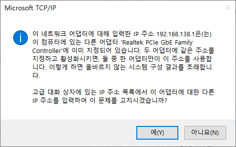 이렇게 뜨길래 아니요로 같은 주소로 설정했더니 노트북 IP도 먹통이 됐다.