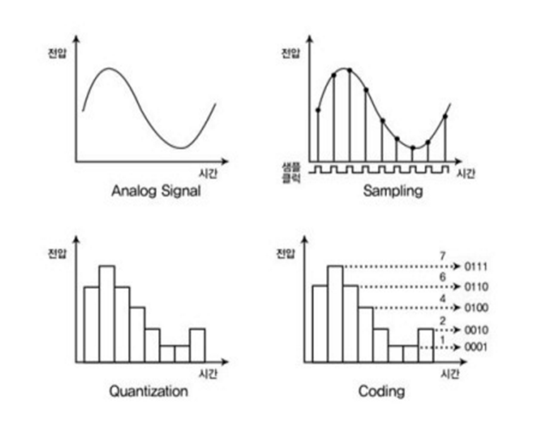 4단계(신호입력, 샘플링, 양자화, 복호화)