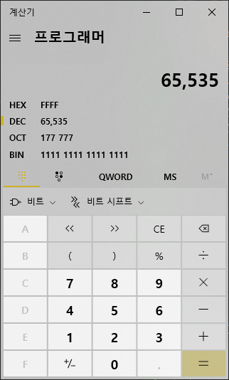 16비트의 최댓값 : 65535 => 0부터 65535까지 십진수로 총 65536