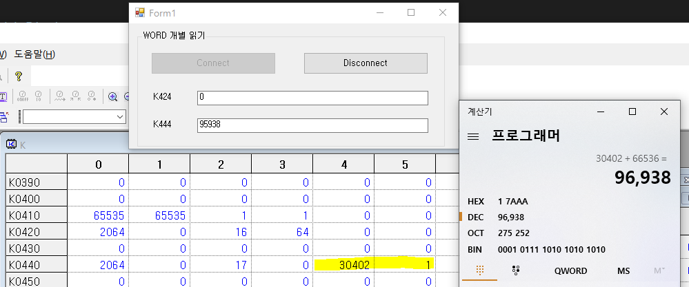 => 65536을 1(K445)에 곱하고 + 나머지값(K444의 30402)을 더한다. 그러면 실제 값인 96,938이 나온다.