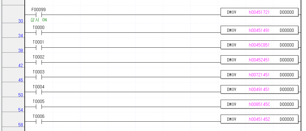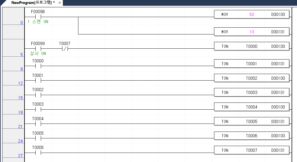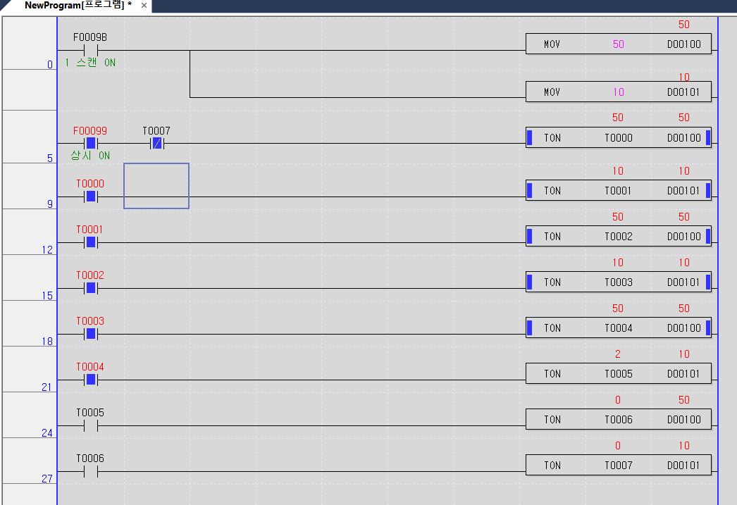 T7이 b접점이므로 마지막에 T7이 on되면 리셋 되고 다시 반복됨