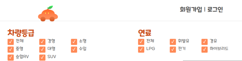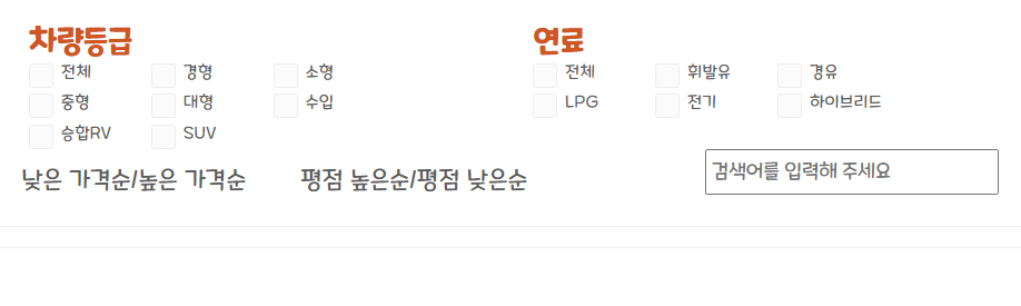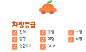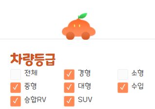 click 이벤트에 selectAllFuels(연료 선택), selectAllRanks(차종 선택) 함수를 걸어 '전체' 체크 value에 따라서 각각 fuels와 ranks 안에 있는 값들이 모두 false / true가 되게 만들었다.