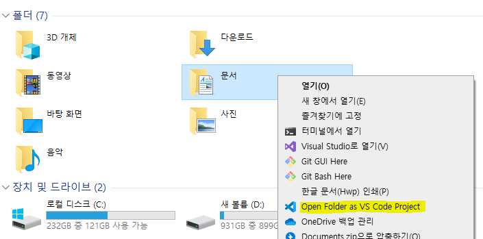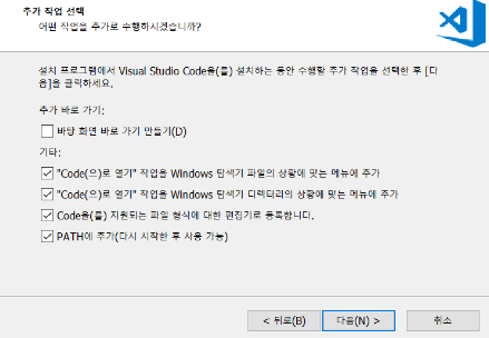 * 옵션 : Code로 열기 작업을 Windows 탐색기 파일의 상황에 맞는 메뉴에 추가