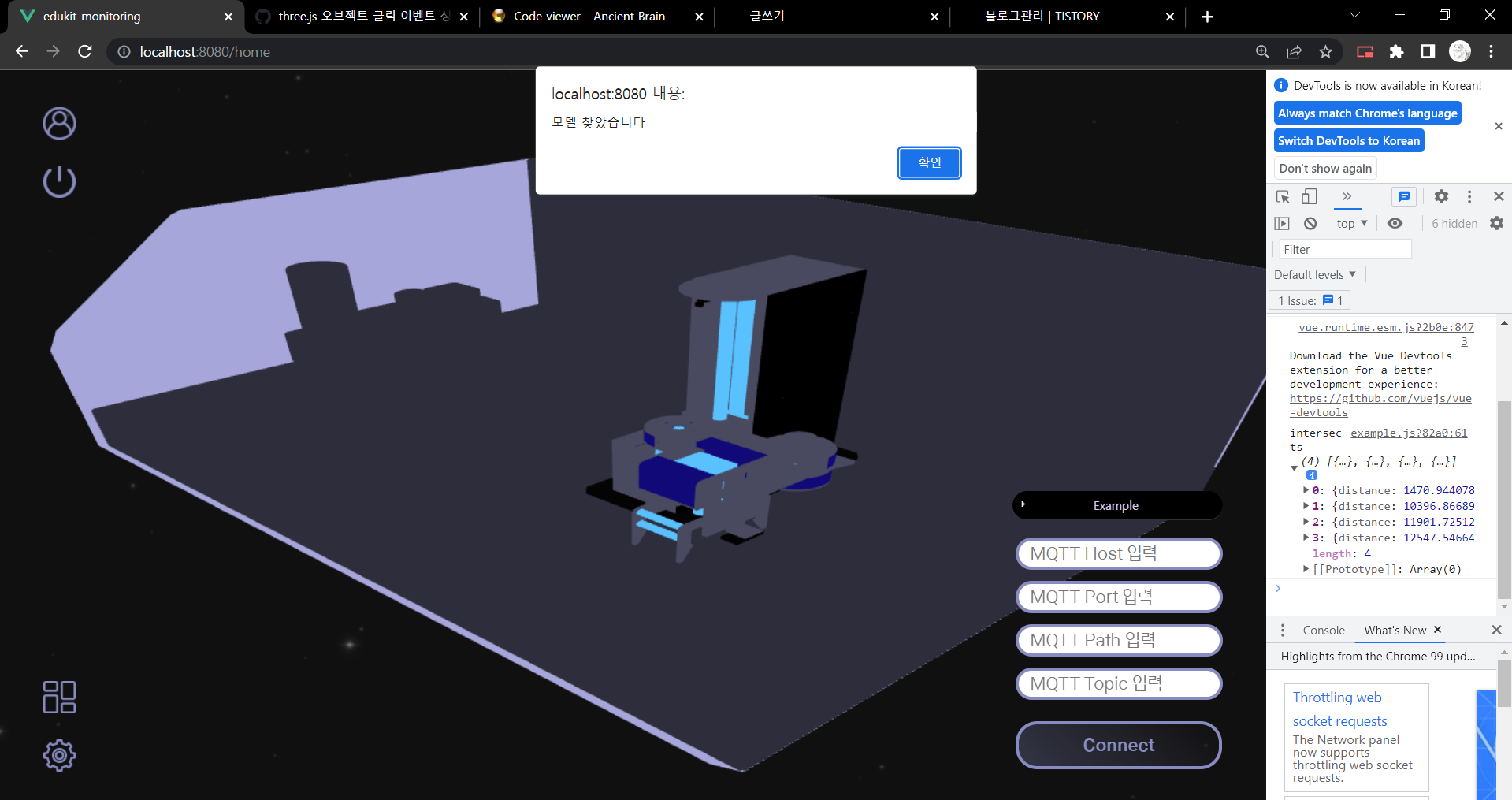 팀원분이 클릭 시에 parent.name을 쓰면 mesh의 부모격 되는 모델명을 찾을 수 있다고 알려주셔서 그걸로 해당 모델을 클릭하면 alert가 뜨도록 코드를 추가했다.